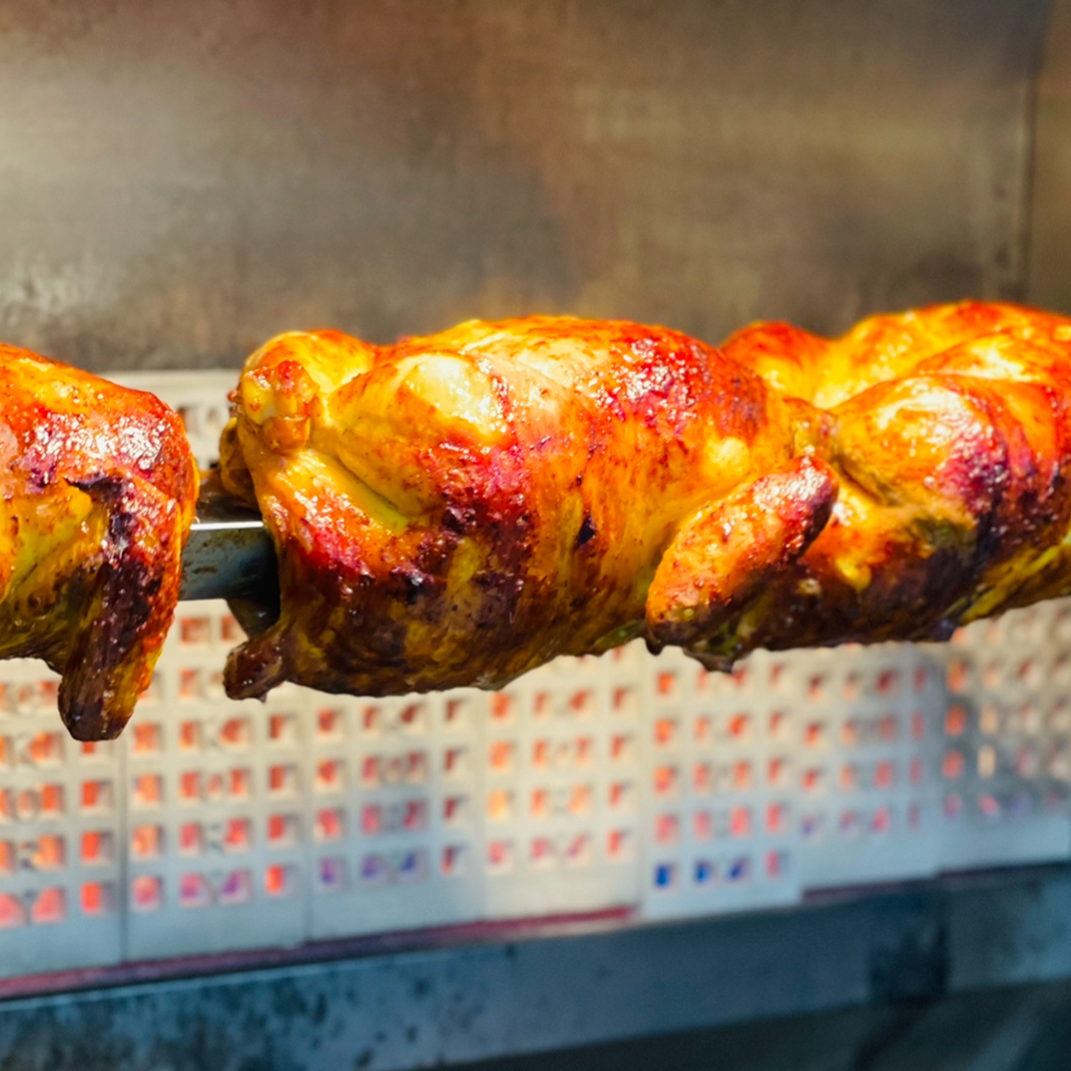 The roasted chicken is split in half lengthwise through the breast and back, leaving fairly equal halves consisting of the same parts.